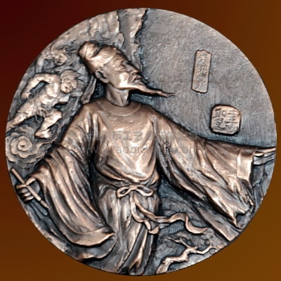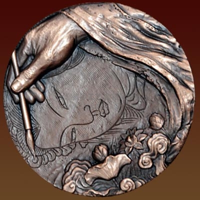 大銅章正面圖案為唐代畫圣吳道子。背面圖案為吳道子的線描人物、蓮荷及祥云。僅寥寥幾筆,便將仙女的云髻峨峨,仙袂飄飄,儀態(tài)萬方之神采勾勒得栩栩如生。