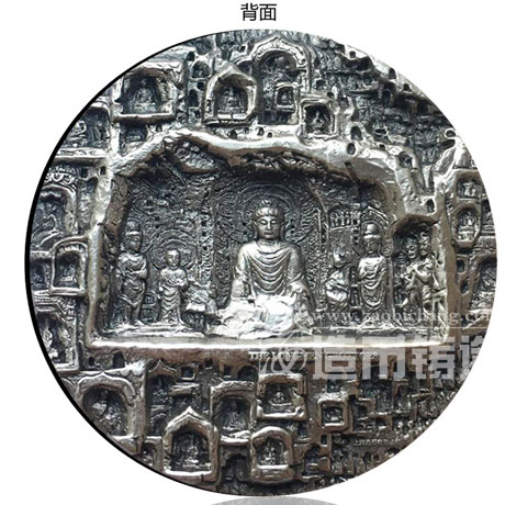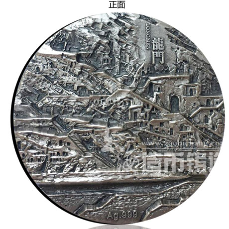 龍門石窟2盎司銀章 ——直徑:40mm、重量:62克、材質(zhì):純銀、工藝:硫化