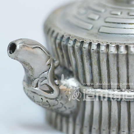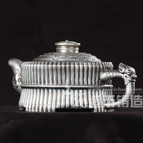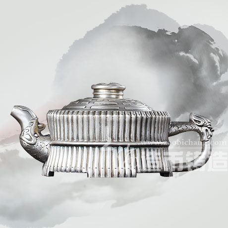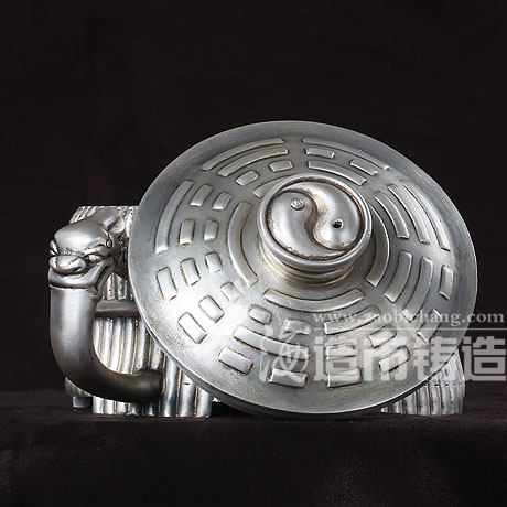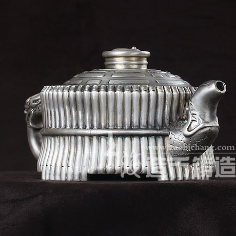 此壺俗稱“龍頭一捆竹”。八卦束竹壺,高7.5厘米,寬10厘米,長16厘米。此壺設(shè)計(jì)極富中國傳統(tǒng)文化意味。器身造型以64根細(xì)竹圍成,工整而光潔,意境自然,腰間束帶以圓竹裝飾,壺底四周由四個(gè)腹部伸出的8根竹子做足,上下一體,顯得協(xié)調(diào)。壺蓋微凸伏羲八卦方位圖,蓋鈕為太極圖式。壺流、壺把則飾以飛龍形象,別有生趣。