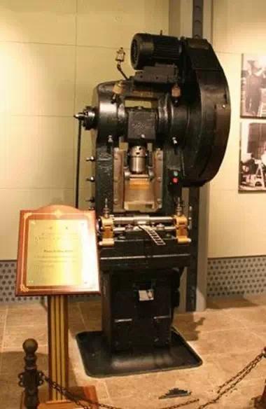 5、制作胚餅:供印制銀幣用的坯餅由沖床(見下圖)完成。標(biāo)準(zhǔn)厚度的條片通過專用沖床上的自動進料軋輥進入沖模,沖下坯餅,展出的沖床每分鐘沖180枚。邊屑由自動裁切成短片,過秤后退回熔煉處。