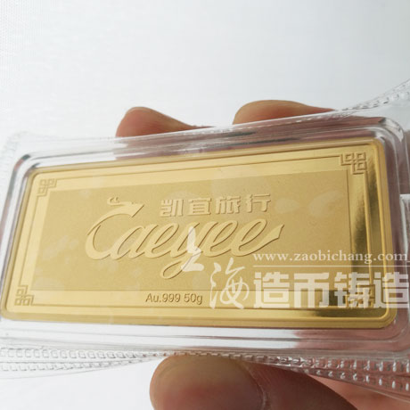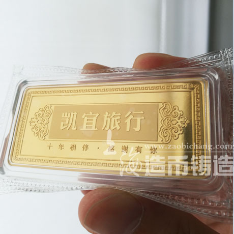 含足金99.9%(Au.999 50g),正面雕刻“凱宜旅行”、“十年相伴,感謝有你“字樣,背面雕刻公司標(biāo)志。
