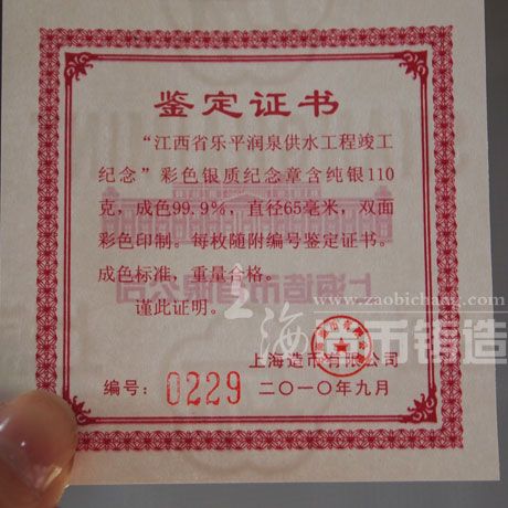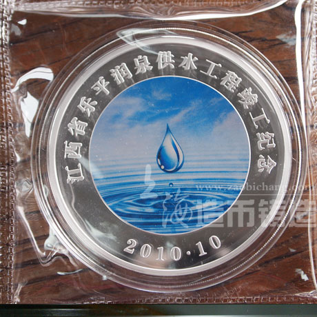 上海造幣廠為了紀(jì)念這一幕就定制了江西省樂平泉水工程竣工紀(jì)念章,為純銀110g純度99.9%,直徑65mm。正面雕刻“江西省樂平潤泉供水工程竣工紀(jì)念”、“2010.10”的字樣,以及彩色的LOGO。背面雕刻“凈水廠鳥瞰圖、Ag.999 110g”的字樣,以及雕刻彩色的鳥瞰圖圖案。采用現(xiàn)代造幣工藝制造,工藝精湛,極具紀(jì)念和收藏價(jià)值,每枚隨附防偽收藏鑒定證書。重量、成色均符合國家標(biāo)準(zhǔn)。