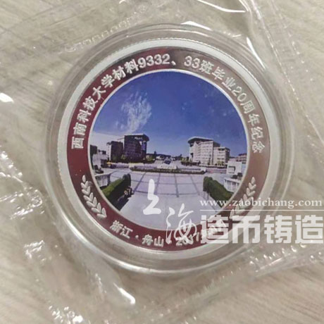 班級為了成立西南科技大學(xué)材料9332、33班畢業(yè)班成立20周年之際,班級選擇定制彩色純銀紀(jì)念章。重量30g,直徑30mm。正面雕刻“西南科技大學(xué)材料9332/33班畢業(yè)20周年紀(jì)念”、“浙江?舟山?2017年8月”的字樣,以及雕刻學(xué)校的圖案,背面雕刻“西南科技大學(xué)”的字樣,以及英文字樣和學(xué)校的LOGO。采用現(xiàn)代造幣工藝制造,工藝精湛,具有極高的收藏價值和紀(jì)念意義。