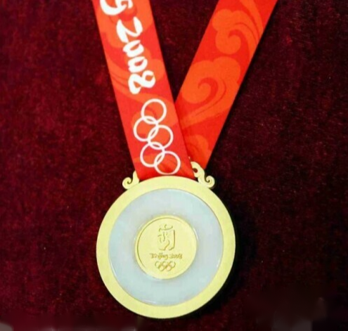 獎(jiǎng)牌背面鑲嵌著取自中國古代龍紋玉璧造型的玉璧,背面正中的金屬圖形上鐫刻著北京奧運(yùn)會(huì)會(huì)徽。由此,北京奧運(yùn)會(huì)的金牌在民間獲得了“金鑲玉”的美稱。
