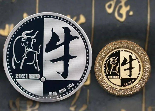 3克金章跟30銀章的正面圖案相同;線描牛造型與“?!弊值姆謪^(qū)組合圖案,并刊“2021”“辛丑”“足金999”字樣。