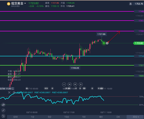 現(xiàn)貨黃金在1714獲得短線支撐,日內(nèi)或朝1733-1741阻力區(qū)間運行;若失守1714恐下行至1707,甚至1699。