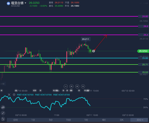 現(xiàn)貨白銀運行在轉(zhuǎn)折點25.86之上,上方阻力區(qū)間在26.40-26.60;若回落至25.86之下則看空,可能下探25.71,然后是25.53。